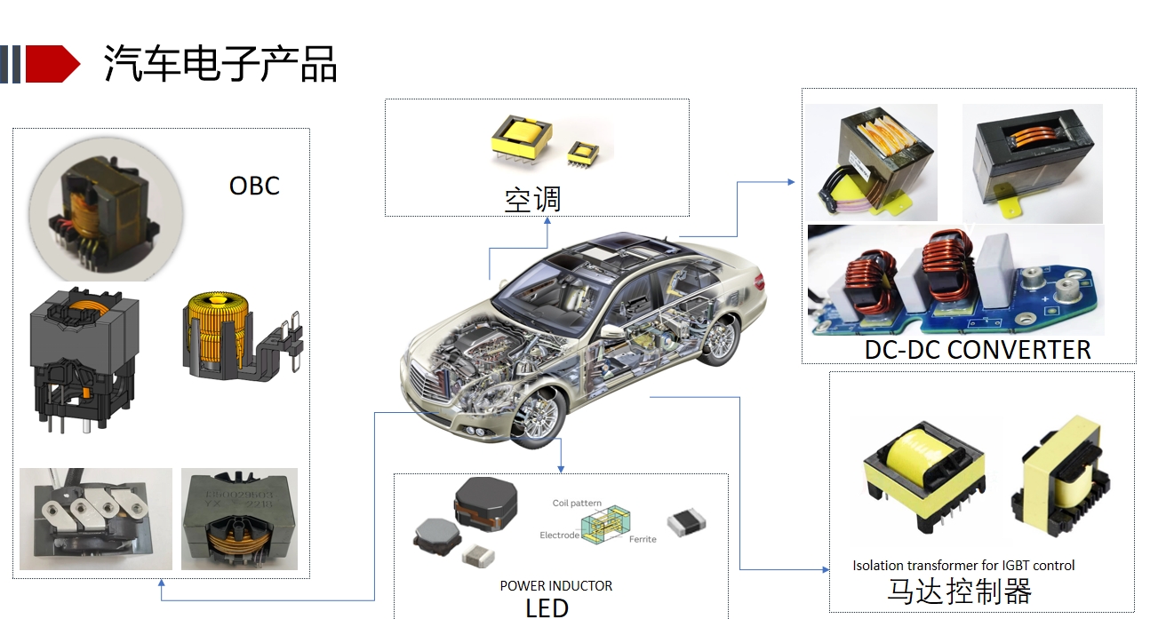 在油电混合动力车和纯电动车引领下,车用领域的电力转换面临了新的技术挑战。磁器件设计对电力转换系统的效率、以及重量和成本都有很大的影响。亚信科技依据市场需求设计并提供磁性元器件的解决方案,可应用在汽车和电动车上,以达到在不同条件下的频率和温度最优化。